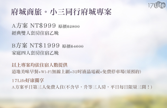 商品訊息簡述: 只要999元起即可享【府城商旅】原價最高4600元小三同行府城專案:(A)經典雙人套房住宿乙晚/(B)家庭奶H套房住宿乙晚,以上專案皆含特色美味早餐+Wi-Fi無線上網+32吋液晶電視+免費停車場(需預約)。17Life好康再享:A方案平日第三人入住免費(不含早餐及升等三人房),每日限量三間!